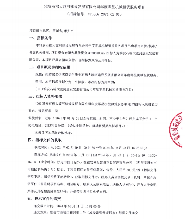雅安石棉大渡河建設(shè)發(fā)展有限公司年度零星機(jī)械租賃服務(wù)項(xiàng)目公告