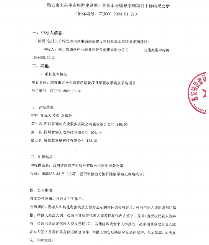 雅安市大興生態(tài)旅游建設(shè)項目景觀水景噴泉采購項目中標結(jié)果公示