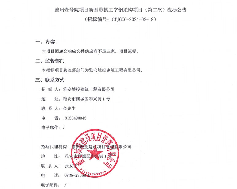 雅州壹號院項目新型懸挑工字鋼采購項目(第二次)流標公告