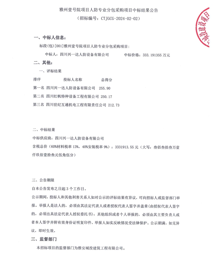 雅州壹號院項目人防專業(yè)分包采購項目中標結果公告