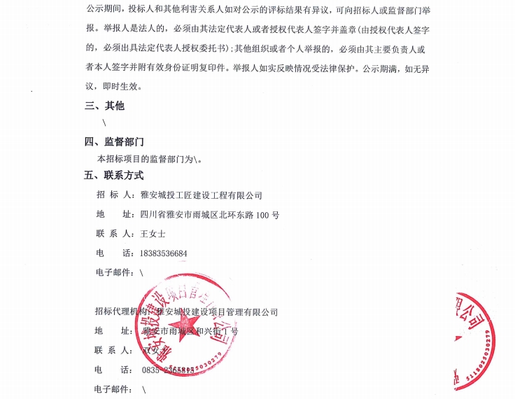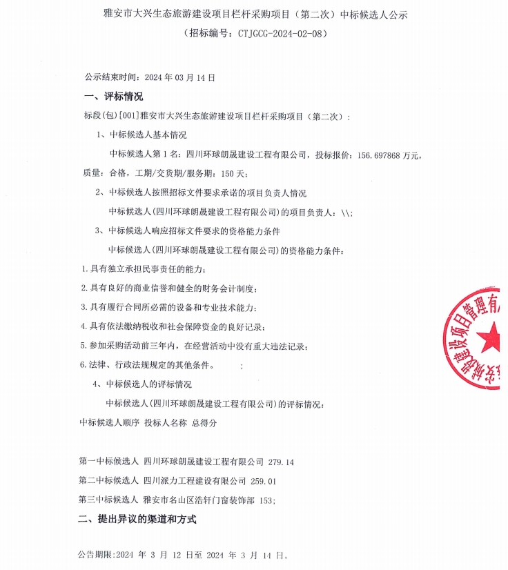 雅安市大興生態(tài)旅游建設(shè)項目欄桿采購項目(第二次)中標(biāo)候選人公示