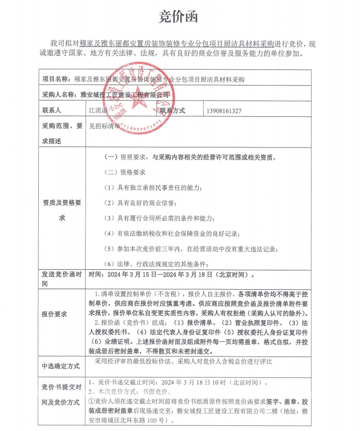 穆家及雅東麗都安置房裝飾裝修專業(yè)分包項(xiàng)目廚潔具材料采購競價(jià)公告