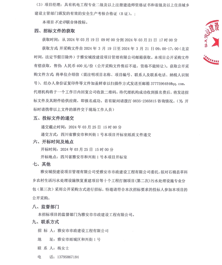 石棉縣草科鄉(xiāng)農(nóng)村生活污水處理設(shè)施恢復重建項目等十個工程打捆項目(第二次)污水處理設(shè)施專業(yè)分包(第三次)公告