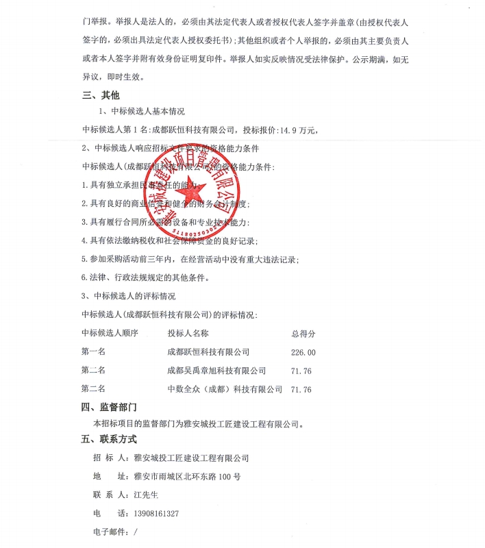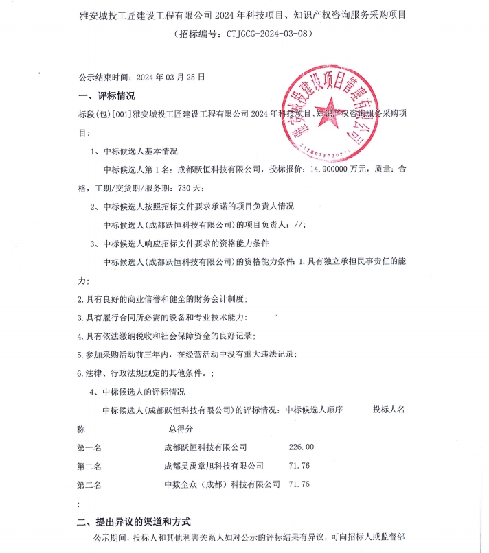 雅安城投工匠建設(shè)工程有限公司2024年科技項(xiàng)目、知識產(chǎn)權(quán)咨詢服務(wù)采購項(xiàng)目公示