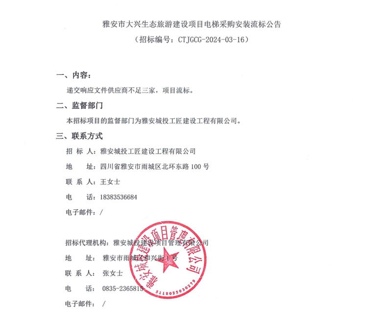 雅安市大興生態(tài)旅游建設(shè)項(xiàng)目電梯采購安裝流標(biāo)公告