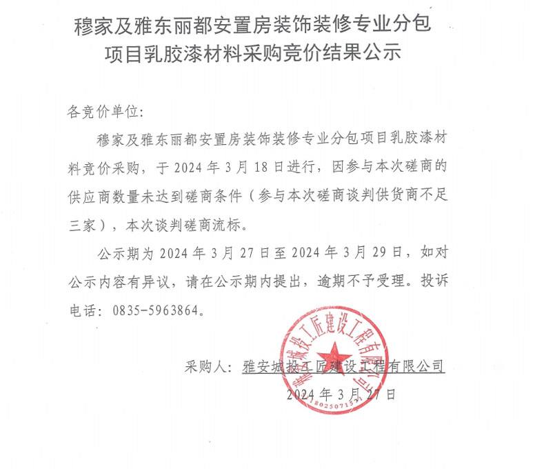 穆家及雅東麗都安置房裝飾裝修專業(yè)分包項目乳膠漆材料采購競價結果公示