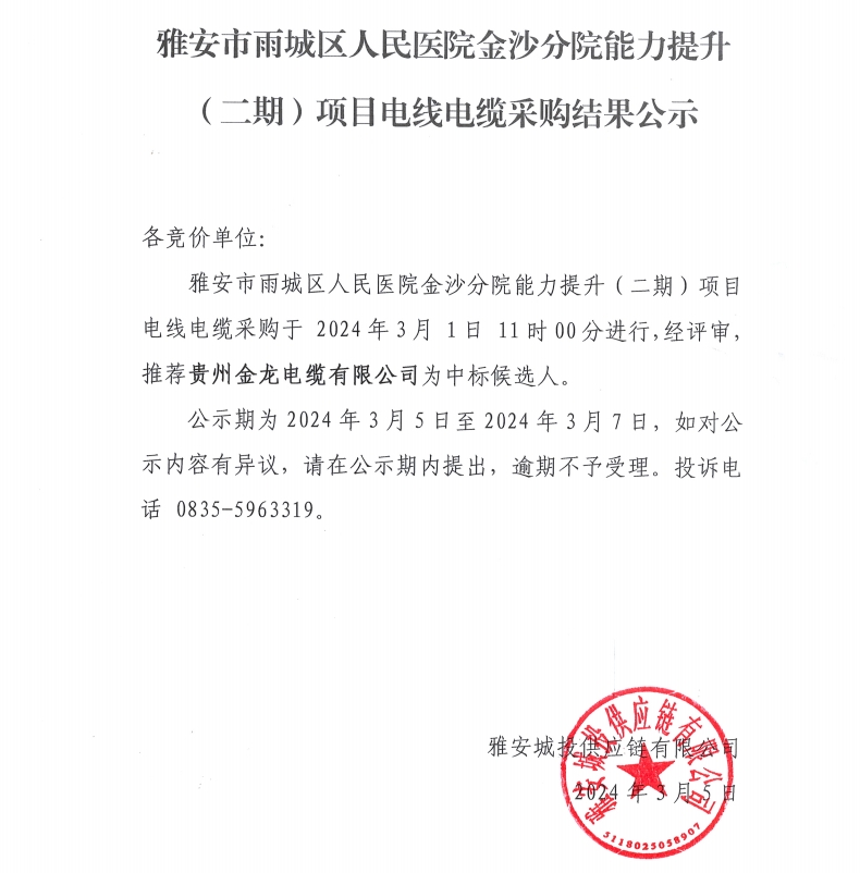 雅安市雨城區(qū)人民醫(yī)院金沙分院能力提升(二期)項目電線電纜采購結果公示