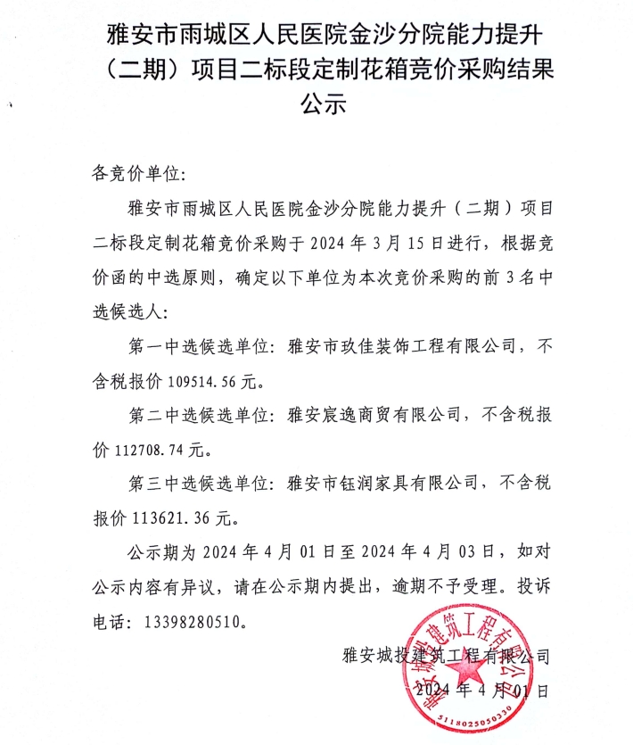 雅安市雨城區(qū)人民醫(yī)院金沙分院能力提升(二期)項(xiàng)目二標(biāo)段定制花箱競價(jià)采購結(jié)果公示