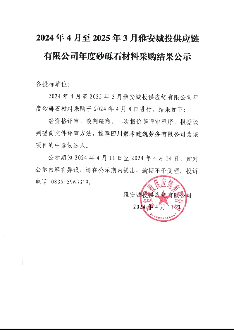 2024年4月至2025年3月雅安城投供應鏈有限公司年度砂礫石材料采購結(jié)果公示