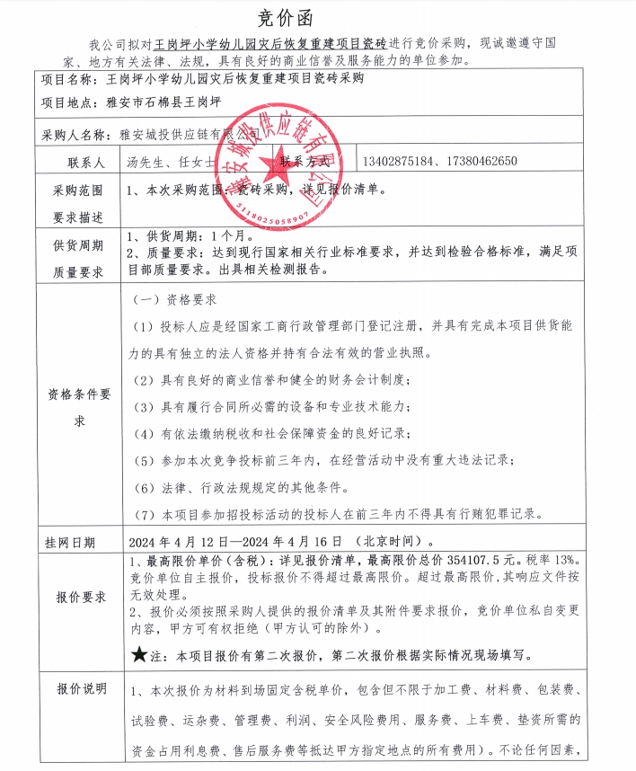 王崗坪小學幼兒園災后恢復重建項目瓷磚競價公告