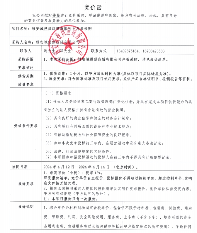 附件2:報(bào)價(jià)清單-雅安城投供應(yīng)鏈有限公司井蓋采購(gòu)