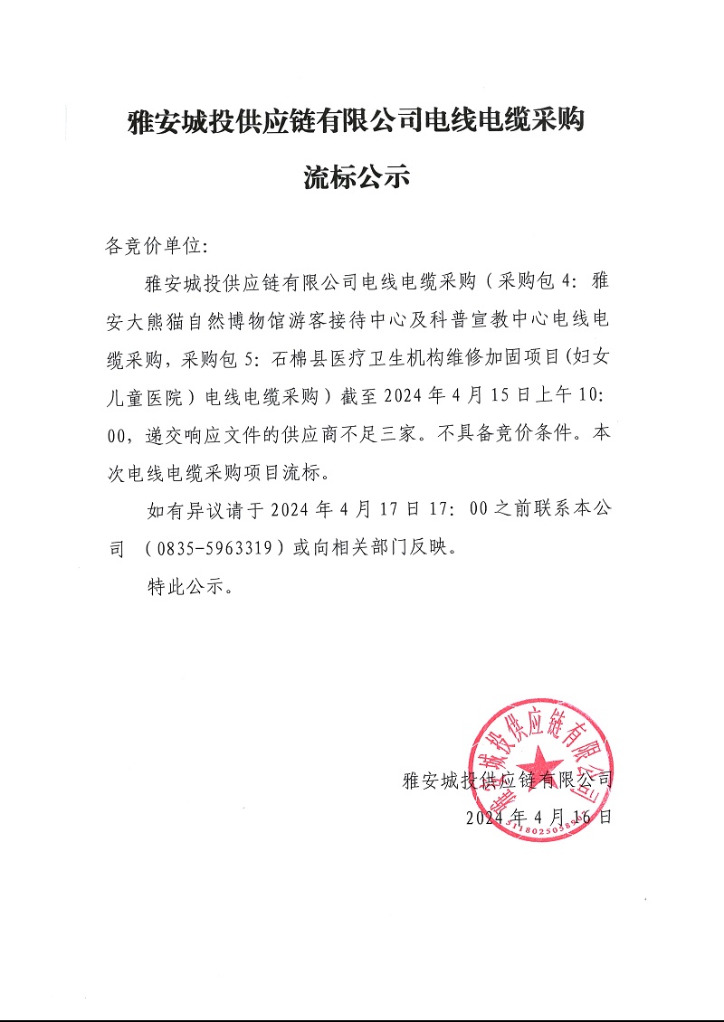 雅安城投供應(yīng)鏈有限公司電線電纜采購流標(biāo)公示