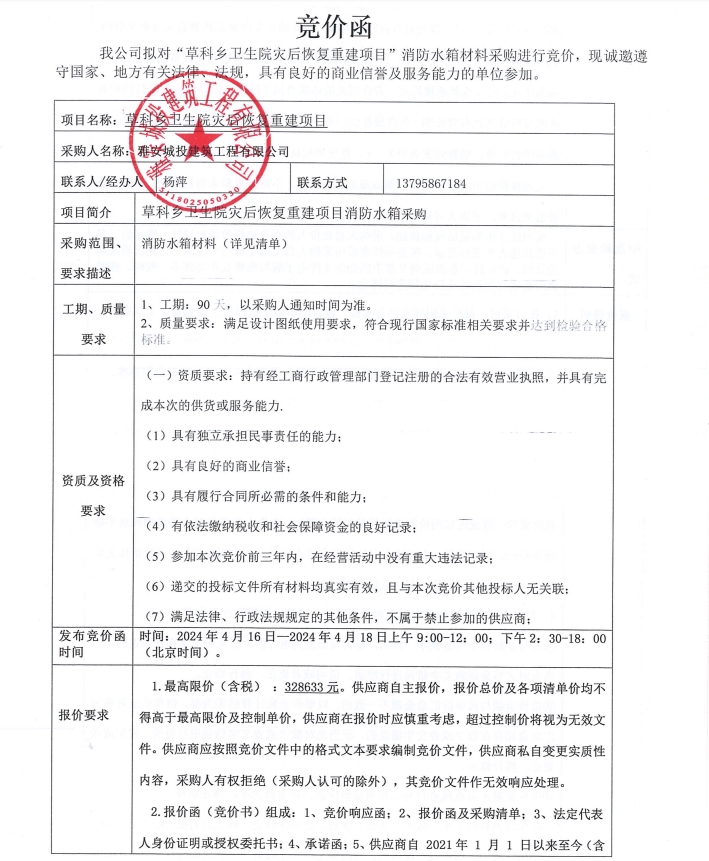 石棉縣草科鄉(xiāng)衛(wèi)生院災(zāi)后恢復(fù)重建項目消防水箱材料采購競價公告