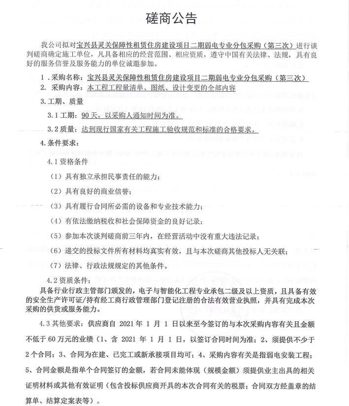 寶興縣靈關(guān)保障性租賃住房建設(shè)項(xiàng)目二期弱電工程專業(yè)分包采購(gòu)(第三次)磋商公告