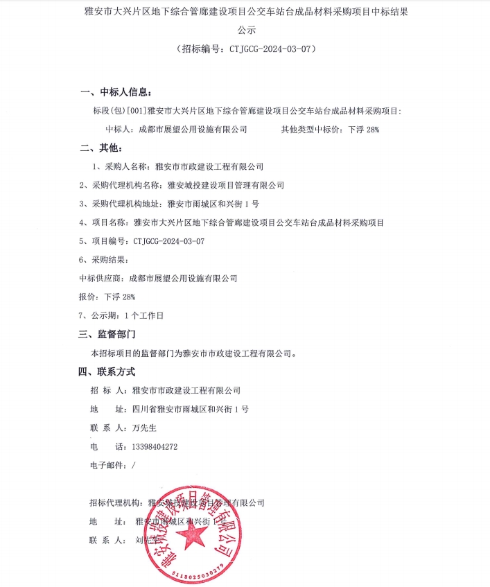 雅安市大興片區(qū)地下綜合管廊建設(shè)項(xiàng)目公交車(chē)站臺(tái)成品材料采購(gòu)項(xiàng)目中標(biāo)結(jié)果公示