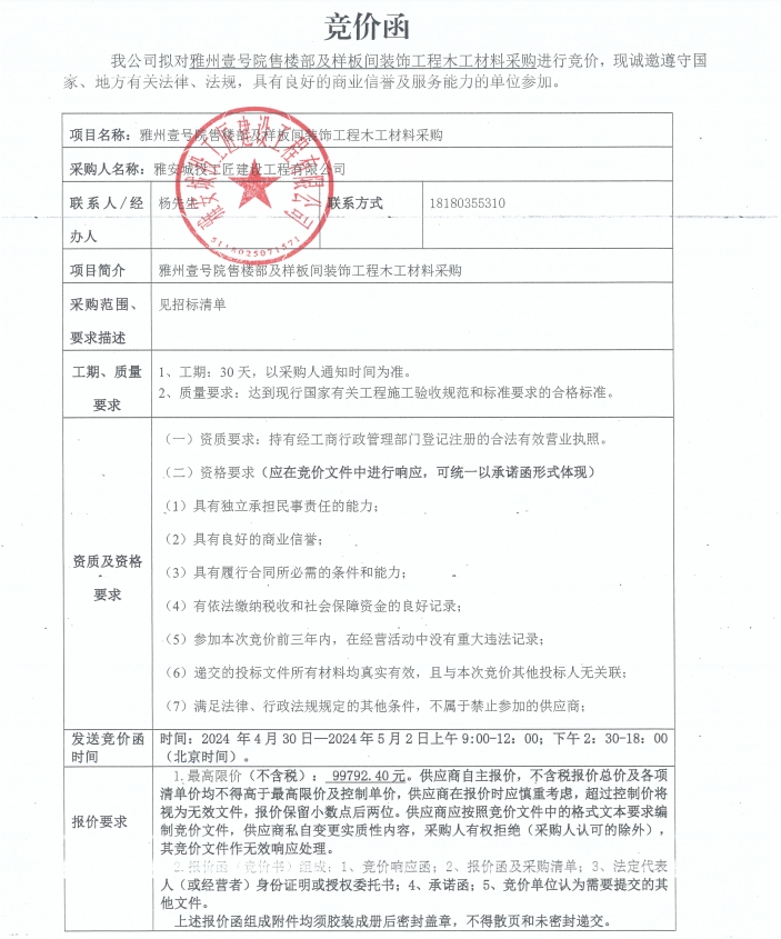 競價(jià)函-木工材料采購-雅州壹號(hào)院售樓部及樣板間