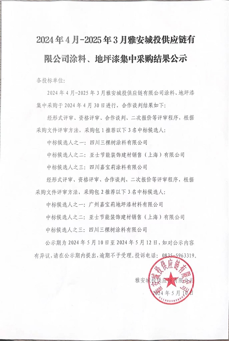 2024年4月-2025年3月雅安城投供應(yīng)鏈有限公司涂料、地坪漆集中采購結(jié)果公示