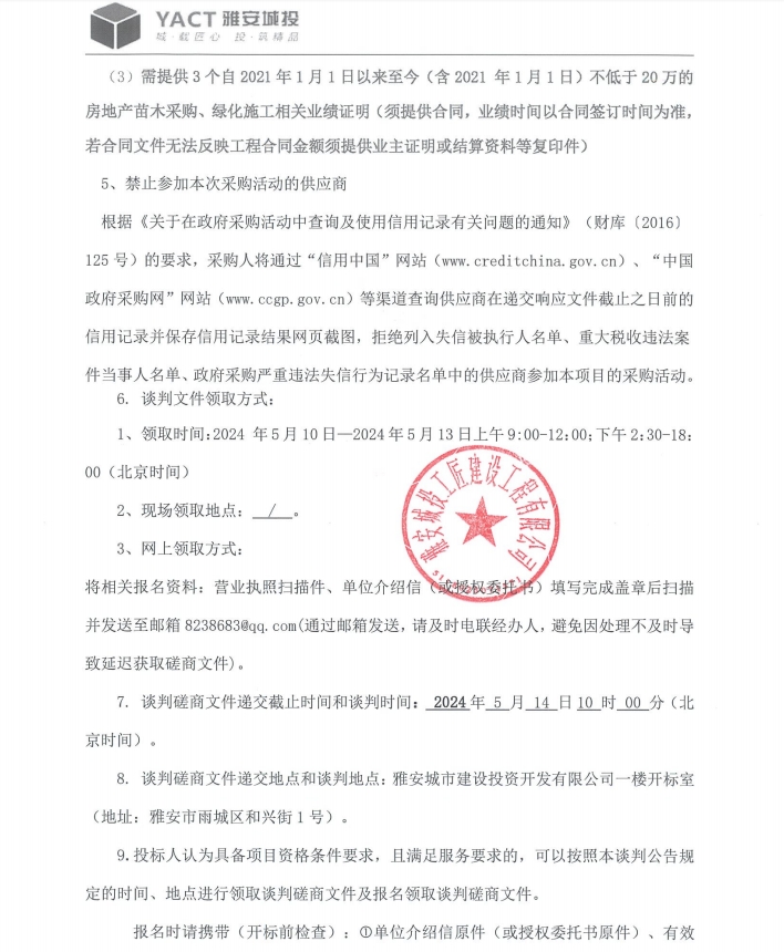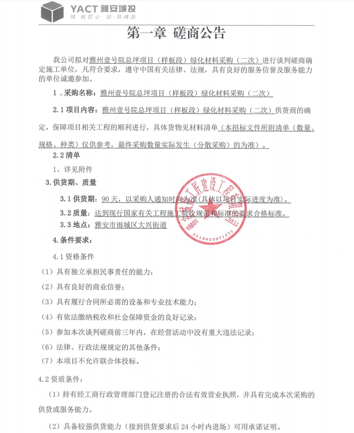 雅州壹號(hào)院總坪項(xiàng)目(樣板段)綠化材料采購(gòu) (二次)磋商公告