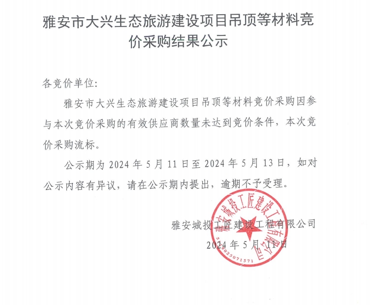 雅安市大興生態(tài)旅游建設(shè)項目吊頂?shù)炔牧细們r采購結(jié)果公示