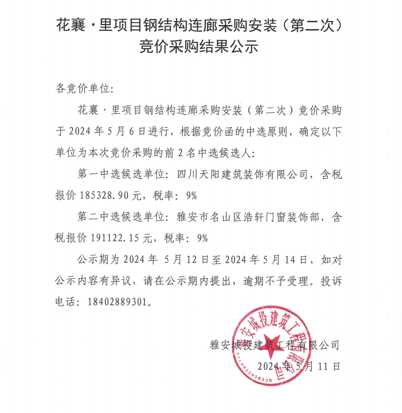 花襄·里項目鋼結構連廊采購安裝(第二次)競價采購結果公示