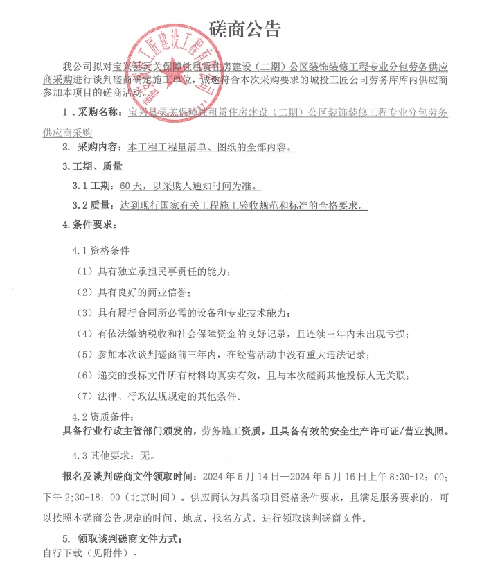 寶興縣靈關(guān)保障性租賃住房建設(shè)(二期)公區(qū)裝飾裝修工程專業(yè)分包勞務(wù)供應(yīng)商采購(gòu)談判磋商公告
