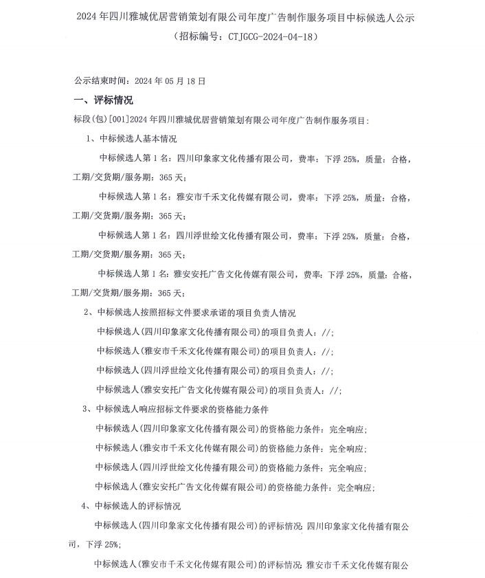 2024年四川雅城優(yōu)居營銷策劃有限公司年度廣告制作服務項目中標候選人公示