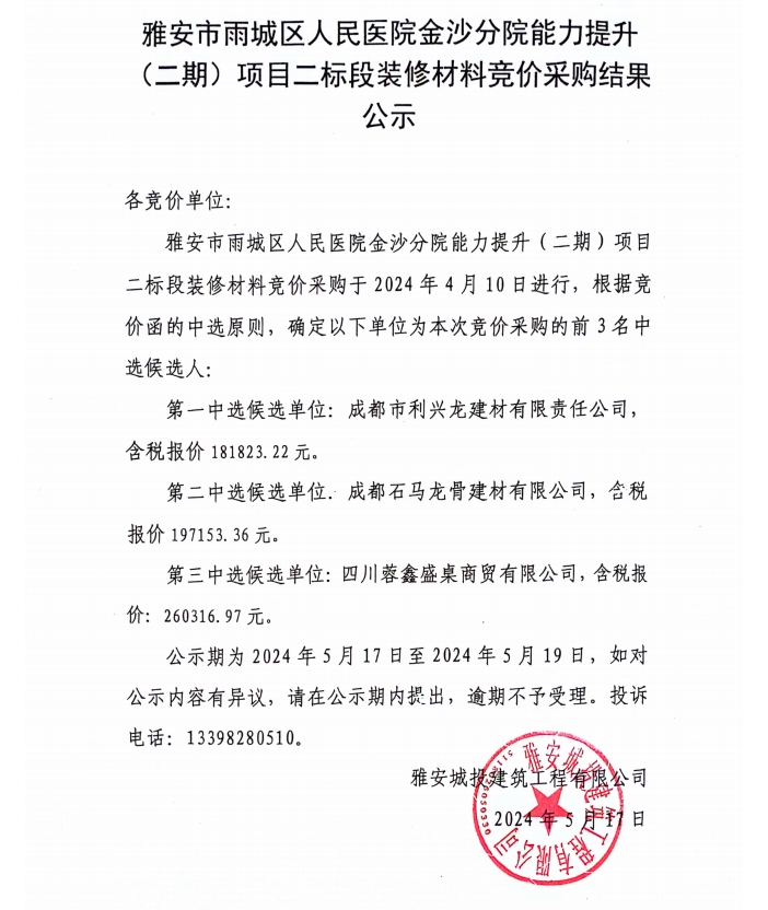 雅安市雨城區(qū)人民醫(yī)院金沙分院能力提升(二期)項(xiàng)目二標(biāo)段裝修材料競價(jià)采購結(jié)果公示