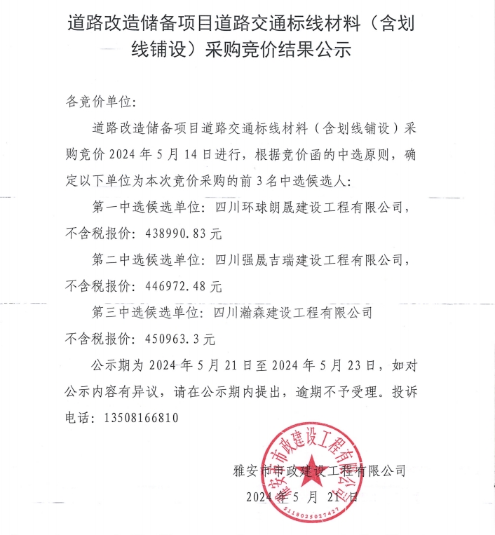 道路改造儲(chǔ)備項(xiàng)目道路交通標(biāo)線材料(含劃線鋪設(shè))采購競(jìng)價(jià)結(jié)果公示