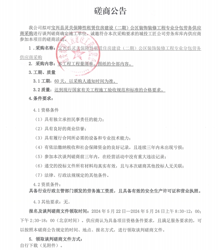 寶興縣靈關(guān)保障性租賃住房建設(shè)(二期)公區(qū)裝飾裝修工程專業(yè)分包勞務(wù)供應(yīng)商采購談判磋商公告