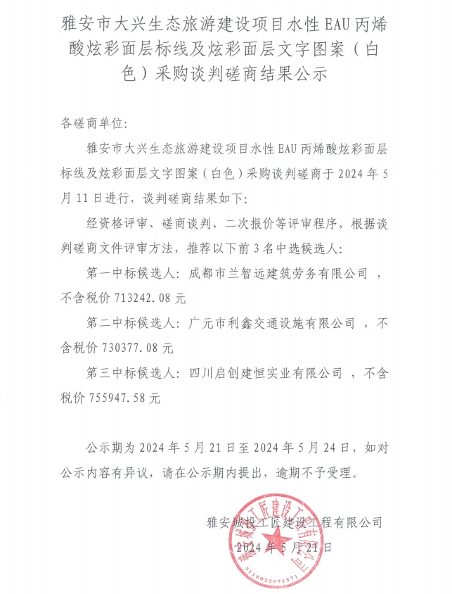 雅安市大興生態(tài)旅游建設項目水性EAU丙烯酸炫彩面層標線及炫彩面層文字圖案(白色)采購談判磋商結果公示