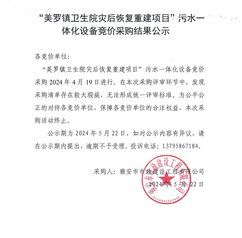 美羅鎮(zhèn)衛(wèi)生院災(zāi)后恢復(fù)重建項目污水一體化設(shè)備競價采購結(jié)果公示