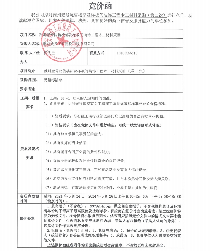 競(jìng)價(jià)函-木工材料采購(gòu)-雅州壹號(hào)院售樓部及樣板間