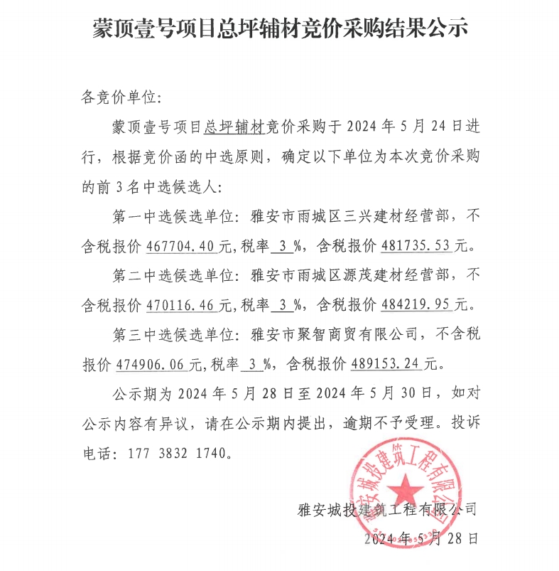 蒙頂壹號(hào)項(xiàng)目總坪輔材競(jìng)價(jià)采購(gòu)結(jié)果公示
