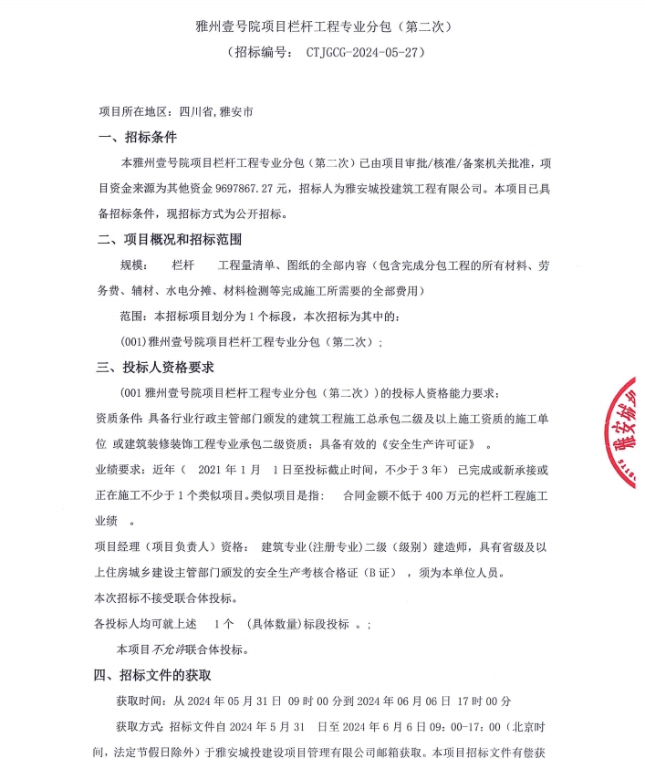 雅州壹號(hào)院項(xiàng)目欄桿工程專業(yè)分包(第二次)公告