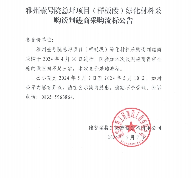 雅州壹號院總坪項目(樣板段)綠化材料采購談判磋商采購流標公告