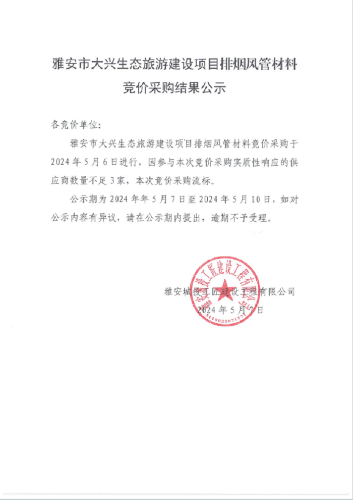 雅安市大興生態(tài)旅游建設(shè)項(xiàng)目排煙風(fēng)管材料競價采購結(jié)果公示