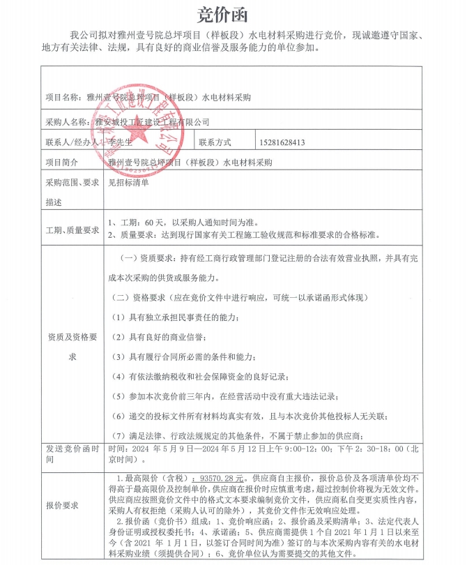 雅州壹號(hào)院總坪項(xiàng)目(樣板段)水電材料采購(gòu)競(jìng)價(jià)公告