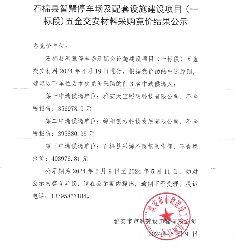 石棉縣智慧停車場(chǎng)及配套設(shè)施建設(shè)項(xiàng)目(一標(biāo)段)五金交安材料采購(gòu)競(jìng)價(jià)結(jié)果公示