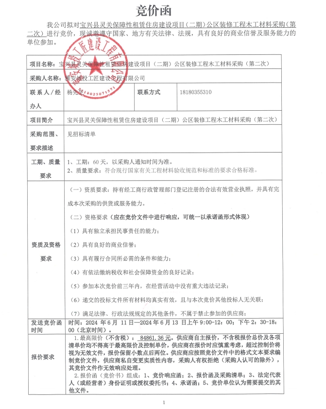 寶興縣靈關(guān)保障性租賃住房建設(shè)項(xiàng)目(二期)公區(qū)裝修工程木工材料采購(gòu)(第二次)競(jìng)價(jià)公告