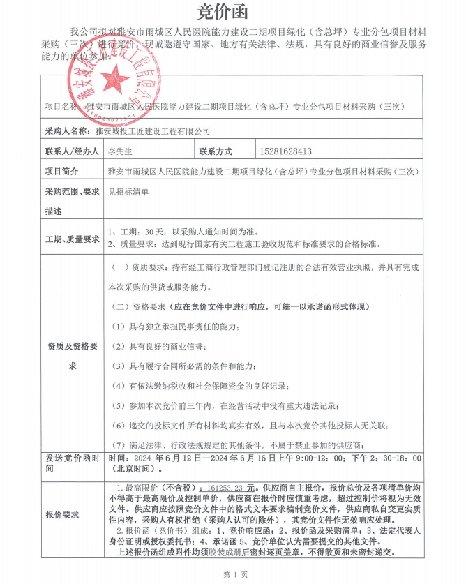 雅安市雨城區(qū)人民醫(yī)院能力建設(shè)二期項(xiàng)目綠化(含總坪)專業(yè)分包項(xiàng)目材料采購(三次)競價(jià)公告