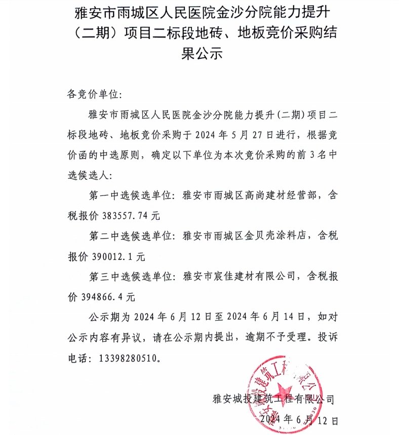 雅安市雨城區(qū)人民醫(yī)院金沙分院能力提升(二期)項(xiàng)目二標(biāo)段地磚、地板競價采購結(jié)果公示