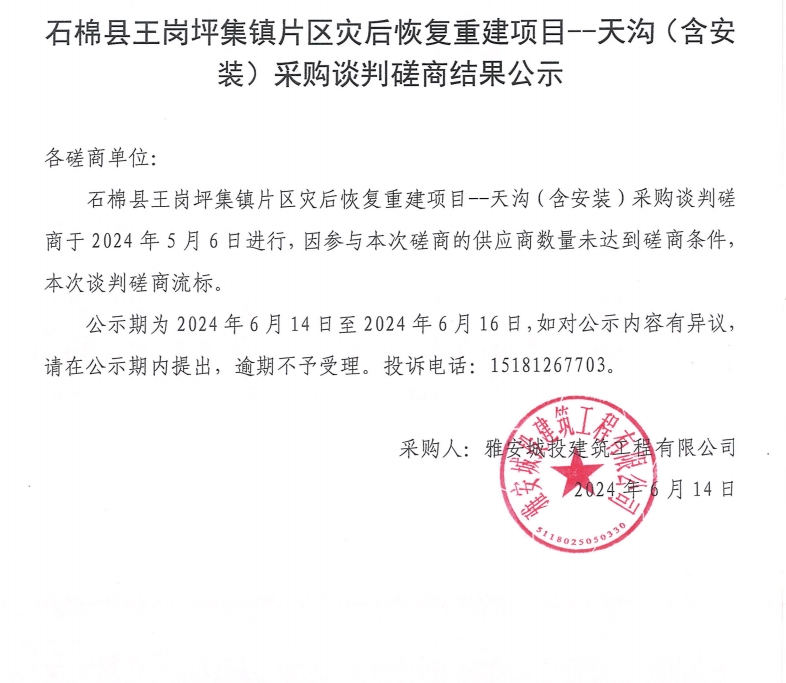 石棉縣王崗坪集鎮(zhèn)片區(qū)災(zāi)后恢復(fù)重建項(xiàng)目--天溝(含安裝)采購(gòu)談判磋商結(jié)果公示