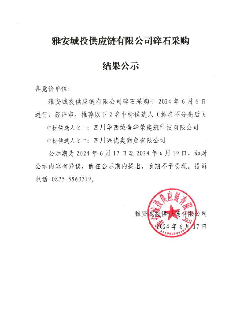雅安城投供應(yīng)鏈有限公司碎石采購(gòu)結(jié)果公示