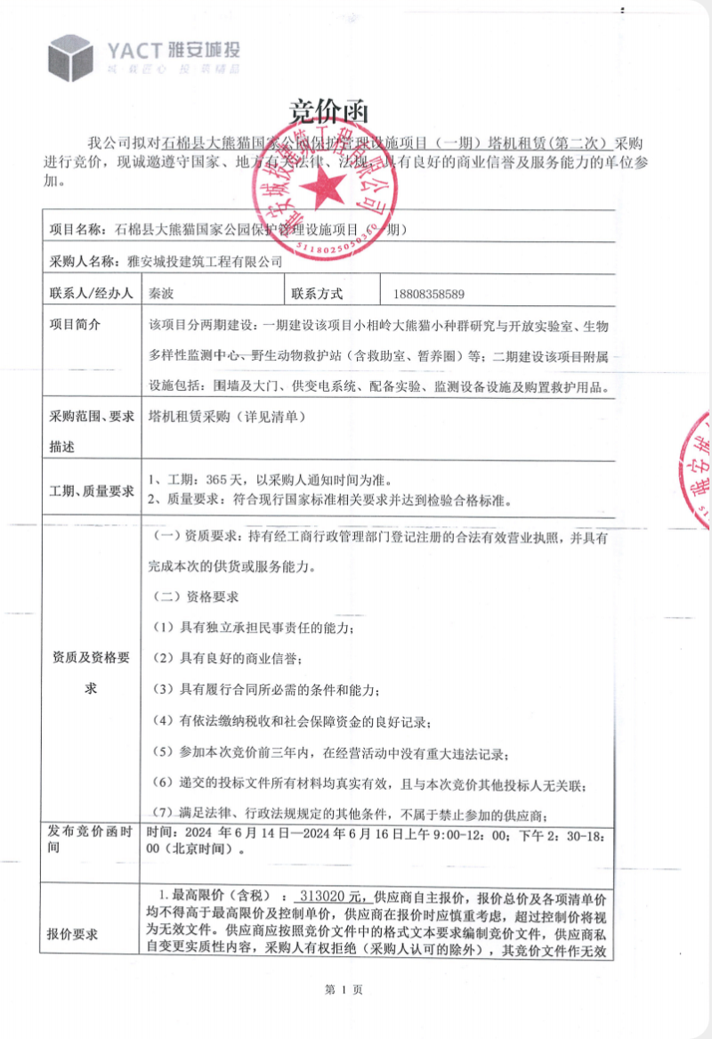 石棉縣大熊貓國家公園保護(hù)管理設(shè)施項(xiàng)目(一期)塔機(jī)租賃(第二次)競(jìng)價(jià)公告