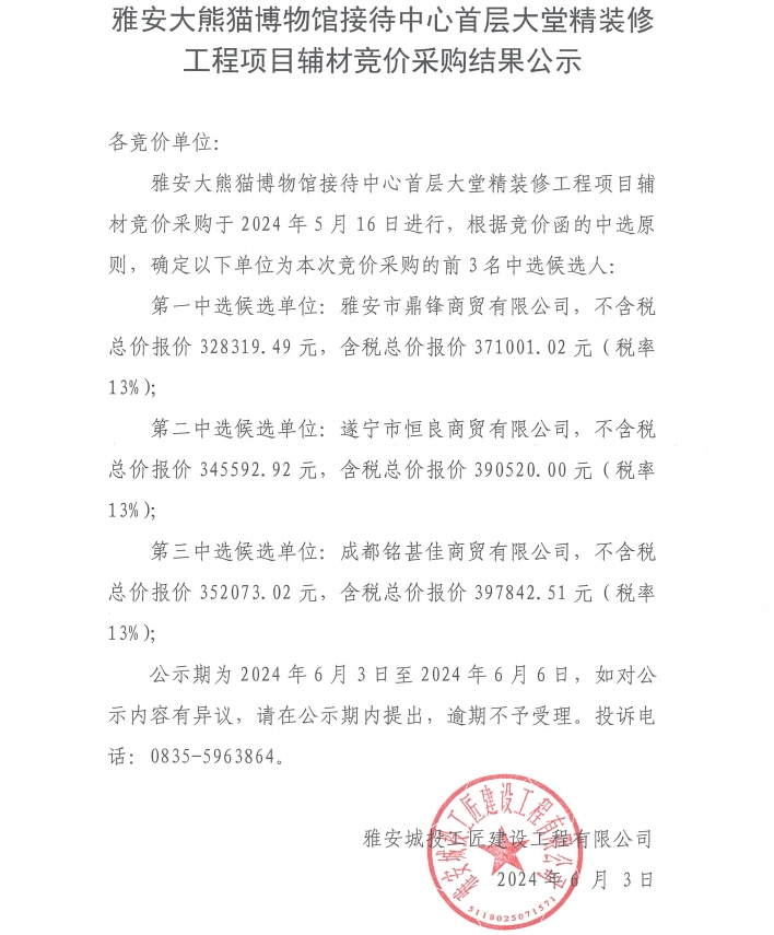 雅安大熊貓博物館接待中心首層大堂精裝修工程項(xiàng)目輔材競(jìng)價(jià)采購(gòu)結(jié)果公示