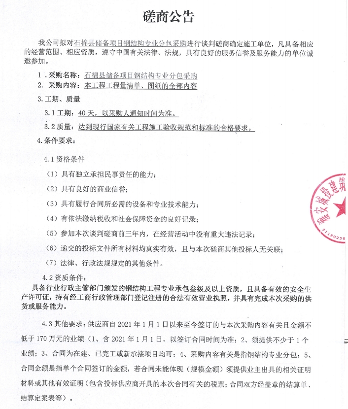 石棉縣儲(chǔ)備項(xiàng)目鋼結(jié)構(gòu)專業(yè)分包采購(gòu)談判磋商公告