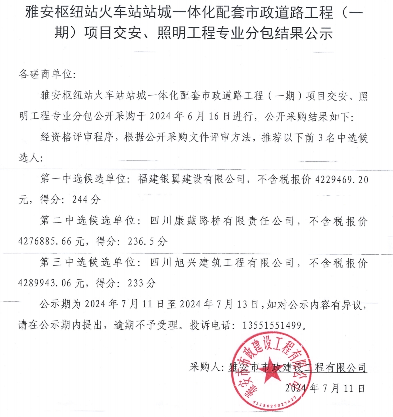 雅安樞紐站火車站站城一體化配套市政道路工程(一期)項目交安、照明工程專業(yè)分包結(jié)果公示