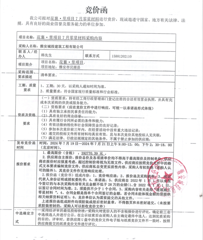花襄·里項(xiàng)目7月零星材料采購(gòu)競(jìng)價(jià)公告