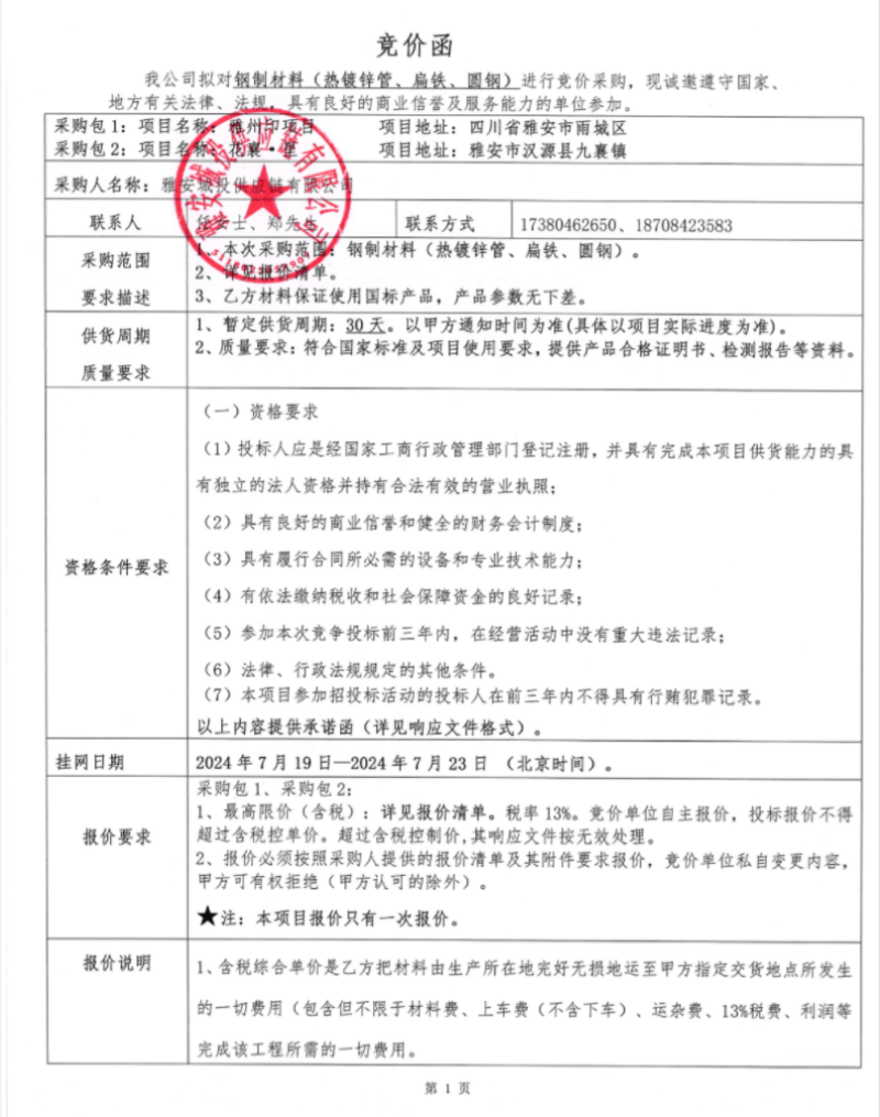 雅州印項目鋼制材料(熱鍍鋅管、扁鐵、圓鋼)采購-報價清單