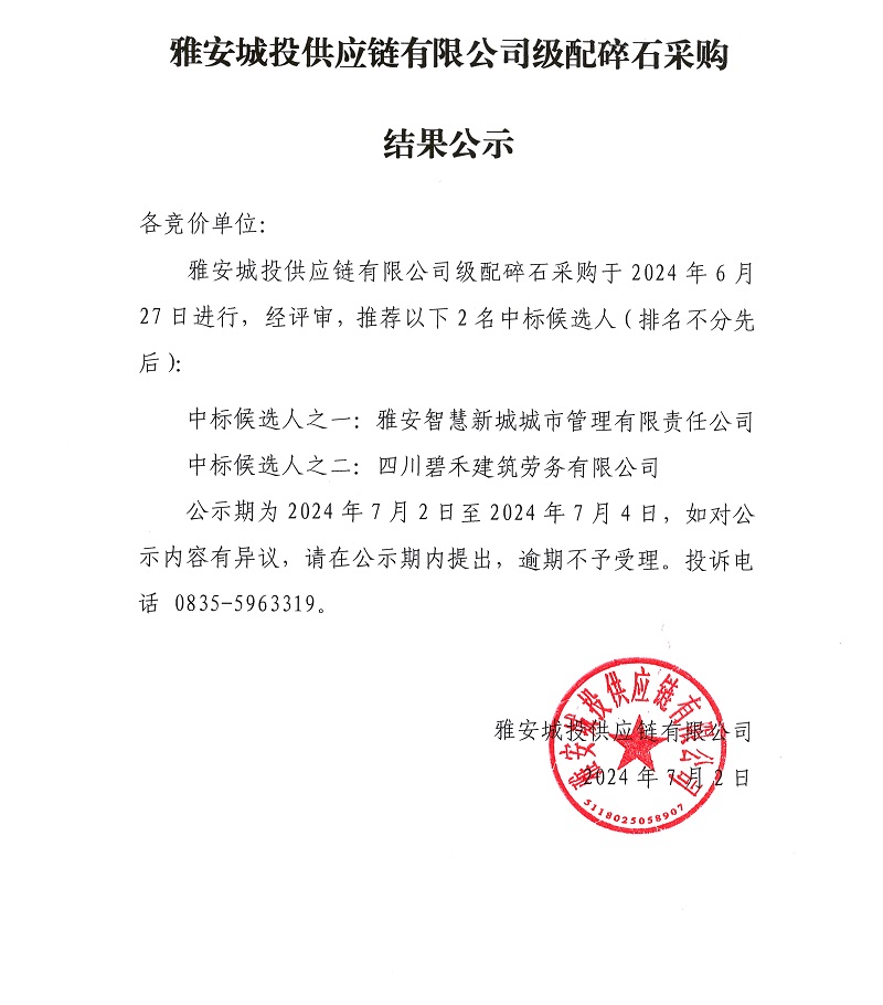 雅安城投供應(yīng)鏈有限公司級配碎石采購結(jié)果公示
